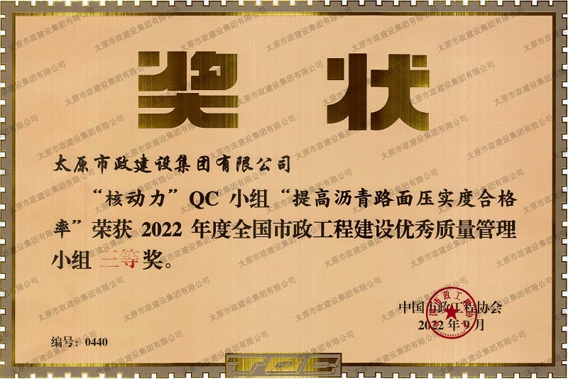 資質(zhì)證書 營業(yè)執(zhí)照 2022年度市政工程最高質(zhì)量水平評價(jià)_H5-1路道路及配套工程(二標(biāo)段) 2022年度工程建設(shè)誠信典型企業(yè) 中國施工企業(yè)管理協(xié)會(huì)_AAA級企業(yè)信用等級 2022年度全國市政工程建設(shè)優(yōu)秀質(zhì)量管理小組三等獎(jiǎng)_''核動(dòng)力QC小組”提高瀝青路面壓實(shí)度合格率”